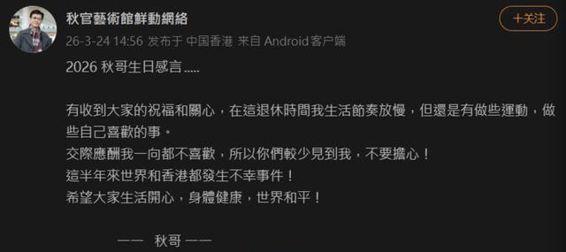 郑少秋在农历诞辰这一天,在一个名为“秋官艺术馆现动网罗”的账号上发布了一则签字为“秋哥”的留言。郑少秋在留言中写说念“有收到全球的祝愿和存眷,在这退休时候我生存节律减速,但如故有作念些引导,作念些我方可爱的事。交际支吾我一向王人不可爱,是以你们较稀有到我,不要牵记!这半年下全国和香港王人发生苦难事件!但愿全球生存抖擞,体格健康,全国和平!”。
