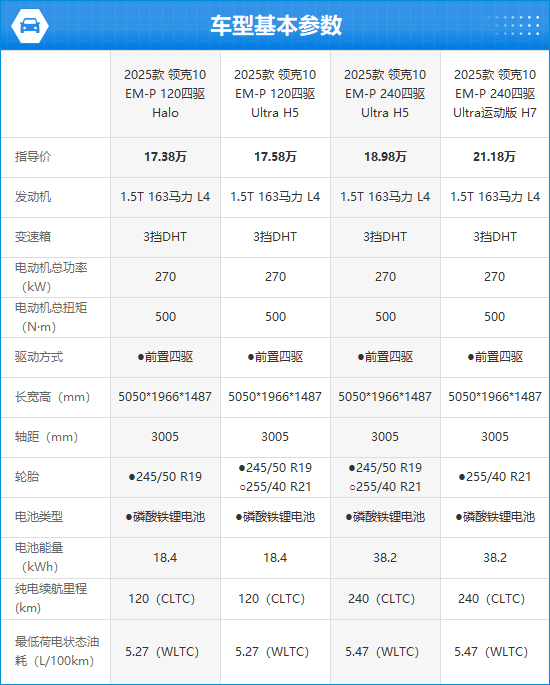 2025款领克10 EM-P搭载EM-P智能电混能源,全系均招揽电动四驱系统,左证车型不同分辩配备能量为18.4kWh和38.2kWh的磷酸铁锂电板组,对应CLTC纯电续航里程分辩为120km和240km。