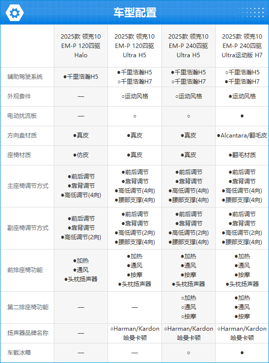 从建设来看,2025款领克10 EM-P全系车型基础功能较为皆全,包括主被迫安全、灯光系统、多媒体等方面均未拉开差距,主要区别体咫尺辅助驾驶和座椅建设上,除初学车型外,其余车型均配备前排座椅腰部援助和推拿功能,顶配车型还标配第二排座椅加热、透风、推拿功能。此外,左证建设不同,全系车型提供沉浩荡H5和沉浩荡H7两套辅助驾驶决议,粉饰不同场景的使用需求。