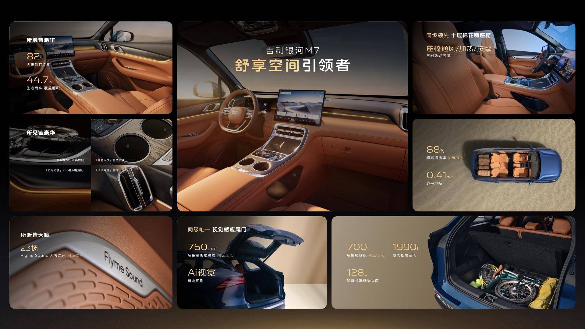 2000W独建功放、23扬声器的Flyme Sound无界之声,协作双层夹胶静音玻璃——这些放在豪华品牌上值得淋漓尽致的成立,星河M7给得绝不踌躇。