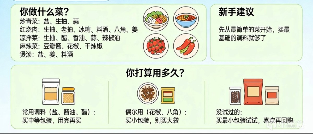 先念念好要作念什么,再买调料。别看着啥齐念念买,回家全落灰。