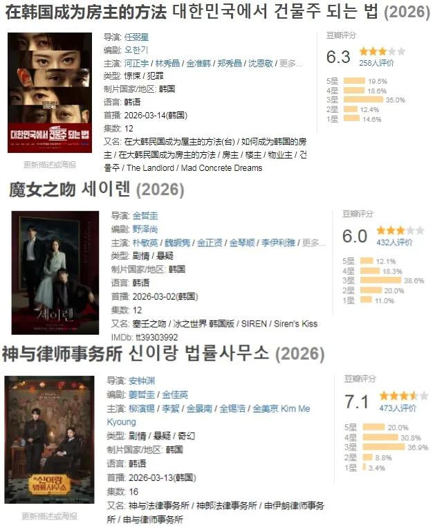 最近,韩剧批量上新,其中不乏大制作、强声势,可不管是河正宇和林秀晶主演的犯法题材《在韩国成为房东的步伐》,女神朴敏英主演的悬疑题材《魔女之吻》,照旧柳演锡和李絮主演的玄幻题材《神与讼师事务所》,齐没能在口碑和收视率上迎来“双丰充”,简直十足成了泡饭,沦为“下饭剧”。