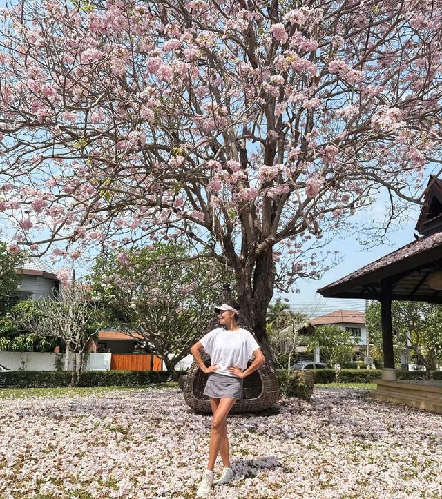 相片里的她站在满树风铃花下,不是那种精修的“白蟾光”,而是晒得均匀健康的小麦色,一看即是长年户外盛开的功劳。看成初代超模,她的肉体齐全没掉线,肩颈线条利落,大长腿成功紧致,肌肉线条透着满满的活力,站在那边就自带温和气场。