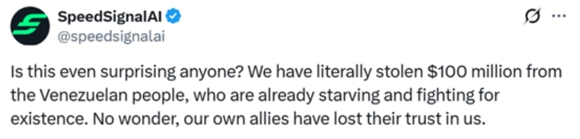 “难说念会有任何东说念主对此感到不测吗?咱们如实从委内瑞拉全国手中窃走了1亿好意思元,而这些东说念主本就在挨饿并为生活回击。难怪连咱们我方的盟友王人对咱们丧失了信任。” ↓