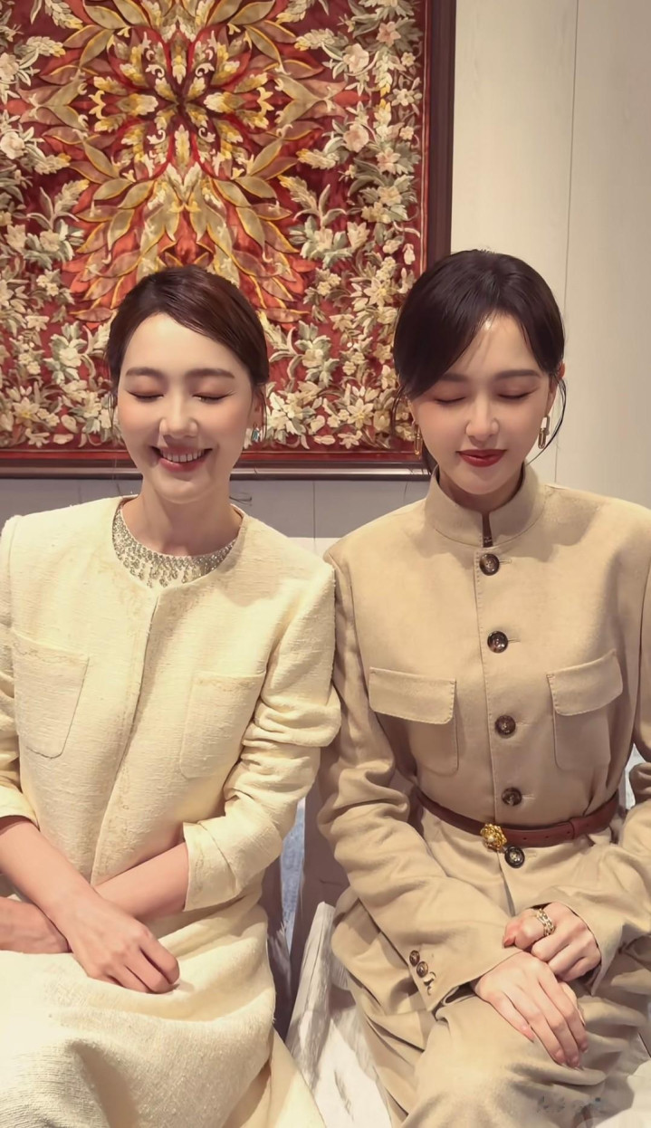 两东谈主都是盘发造型,皇冠穿安谧米色小香风套装,唐嫣则是卡其色定制款。