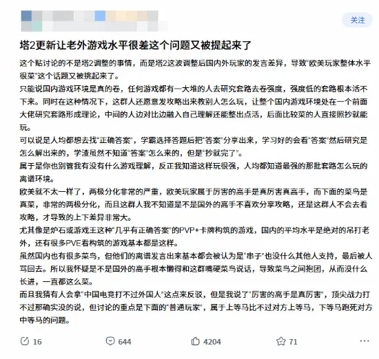 近日,贴吧热议对于《夷戮尖塔2》更新后中外玩家发言各异的帖子激发平凡探究,话题聚焦于泰西玩家合座游戏水平偏低的风物,以及中外游戏社区环境的内容区别。