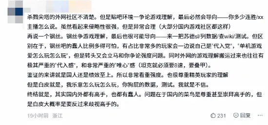 有玩家称,国内游戏社区呈现赫然的“强度内卷”特征:无数玩家会主动研究最优套路与游戏强度,强度不及的玩法难以在社区中传播;同期,能手乐于共享攻略与表面,造成“大佬研究中枢玩法—中层玩家优化调度—生人径直鉴戒”的生态,玩家深广追求“高效正确的玩法谜底”,合座平均游戏水平较高。即便存在水平偏低的玩家,其辩认剃头言也会被社区主流声息质疑,难以造成影响力。