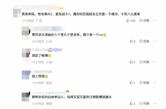 有无数的《绝地潜兵2》《星际战士2》《清早杀机》等游戏的玩家也在此发言,称遭遇的坑人玩家多为泰西东谈主。